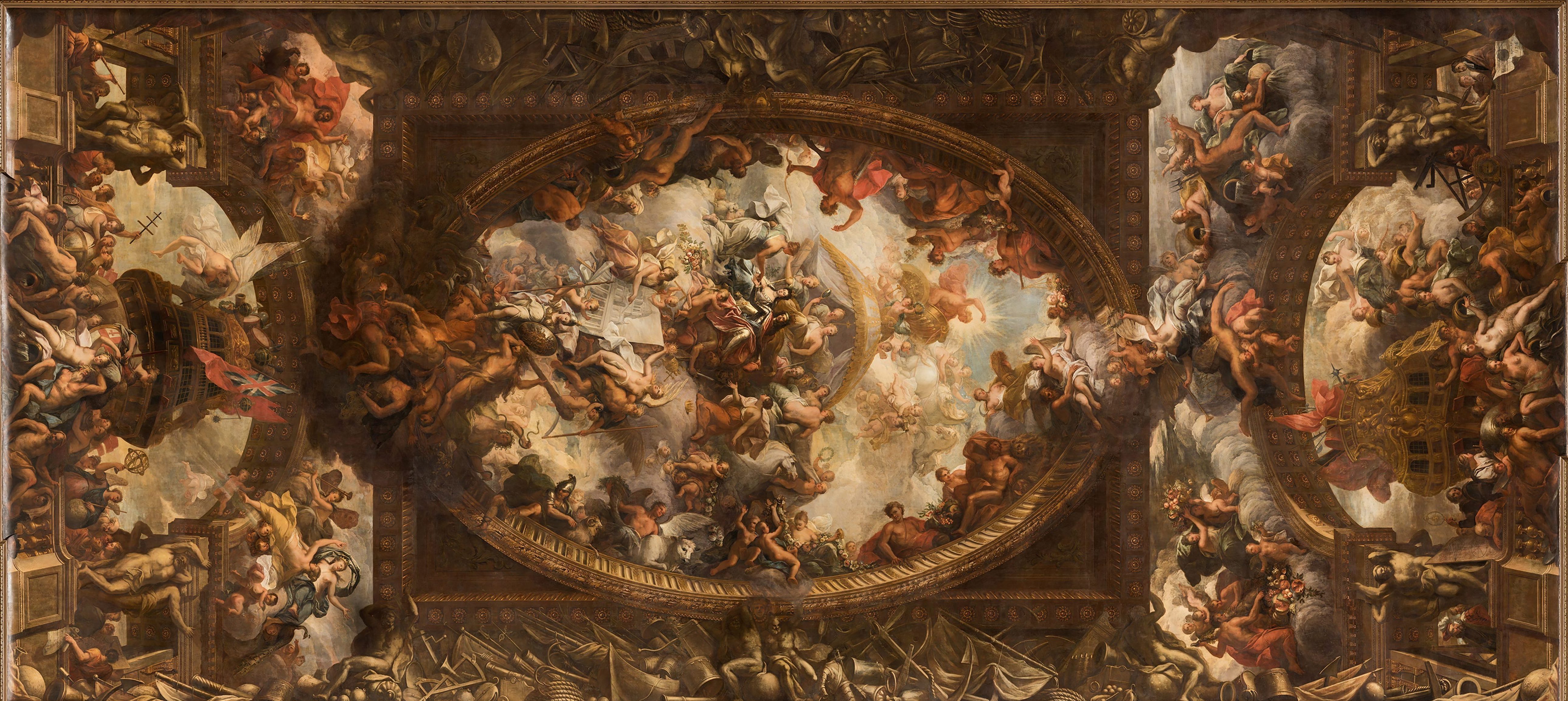 The central narrative focuses on a pivotal moment when the United Kingdom was created and became a dominant power in Europe. The paintings celebrate Britain’s political stability, commercial prosperity and naval power. It also depicts the Protestant accessions to the throne of King William III and Queen Mary II in 1688 and George I in 1714.