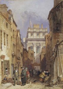 Clarkson Stanfield’s watercolour of Fisher Lane, Greenwich (1848) shows how close the town was to the Hospital before clearance in the 1840s. Two Greenwich Pensioners, a tea-house and an oyster dealer can be glimpsed. There were said to be 88 inns and pubs within walking distance of the Hospital.