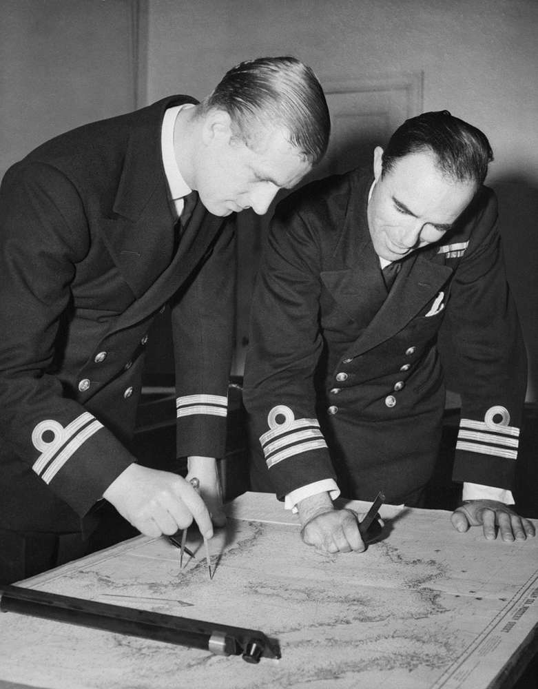 The Duke of Edinburgh, left, reviews a navigational chart with Commander W.G.F. Bird, of the British Royal Navy, on May 12, 1948 at the Royal Naval College Greenwich, England. © Eddie Worth/AP Image