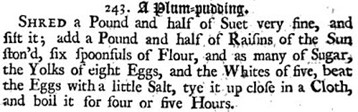 An early written recipe for a simple plum pudding can be found in John Nott’s The Cooks and Confectioners Dictionary published in London in 1723: